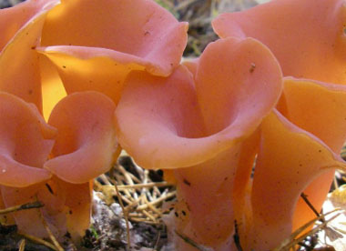 This edible fungus has a petal-like firm, yet gelatinous (sometimes rubbery) fruiting bodies that are quite easy to identify because of the shape and colour. Some people refer to their shape as being similar to a horn or a trumpet. The stem base has regions of white mycelium.