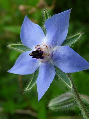 Borage has brilliant, blue flowers that are star-shaped with prominent black anthers forming a cone-like structure.