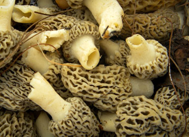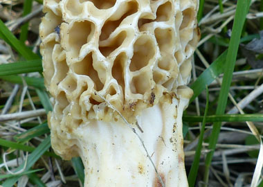 Yellow morels are edible and have a distinctive honeycomb-like upper portion that is composed of a network of ridges and pits giving it a sponge-like appearance. The base is white or sandy-coloured, sometimes marked with brown blotches near the base; flesh is tough and it is hollow. IMPORTANT: There are false morels that are NOT edible - those caps are wrinkled not pitted and the cap hangs freely over the stem. There are recorded deaths from people eating false morels.