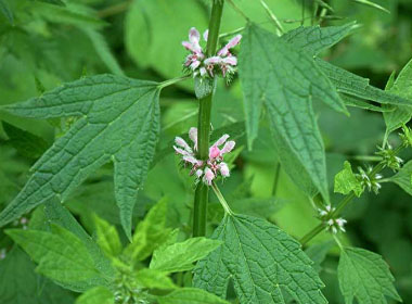 The leaves are dark green on the top and pale below. They are deeply lobed into three and are somewhat oak-shaped. Some people may have a slight reaction (itching) to the motherwort leaf if they break it up.