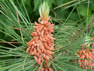 Red pine is monoecious; males are almost round, light red, and in large clusters at branch tips. Females are round, have a short cone, and are reddish brown. Flowers appear during spring; pollination takes place during May-June, and the fertilization occurs in mid-July the following year.
